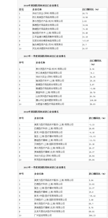 6月2日,2017中国(国际)医用耗材大会媒体交流会在北京举行,中国医药保健品进出口商会发布了2016年度我国医用耗材出口企业排名、2017年一季度我国医用耗材出口企业排名情况,具体如下: